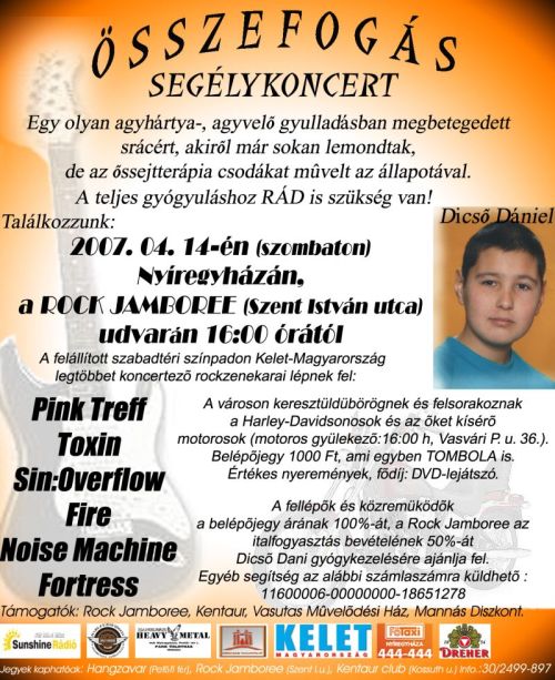 linket a címsorba. 2007.04.14. Köszönet a több mint 300 segíteni akaró embernek, akik eljöttek szombaton a segélykoncertre. Ezúton külön köszönet azoknak akik segítettek, hogy létre jöhessen ez a rendezvény.Na és persze nem utolsó sorban Nektek, Fortress rajongóknak, akiknek köszönjük ezt a felejthetetlen estét. 2007.04.12. 2007. április 13-14 Interjú a Kölcsey Tv, Víg-Kend címû adásában. 2007.04.10. 2007. április 14-én ÖSSZEFOGÁS SEGÉLYKONCERT lesz a Rock Jamboree (Nyíregyháza, Szent István u.) udvarán felállított szabadtéri szinpadon Dicsõ Dani megsegítésérére. A rendezvényen fellép 6 kelet-magyarországi rockzenekar: Pink Treff - Toxin - Sin: Overflow - Fire - Noise Machine - Fortress. Több motoros klub és taxisok is jelezték, hogy részt vállalnak a következõképpen: Nyíregyházán a Vasvári Pál u. 36. sz. alatt (Harley Davidson szalon elõtt) gyülekeznek 16 órától, majd 17 órakor keresztül dübörögnek a városon és megérkeznek a Rock Jamboree udvarára. Õk is, mint ahogy a zenekarok tagjai, a szervezõk, a technikai személyzet, a rajongók és más segítõszándékú emberek megvásárolják az 1000 Ft-os belépõjegyet, ezzel is hozzájárulva az ÖSSZEFOGÁS SEGÉLYKONCERT céljának eléréséhez. AZ ÖSSZEFOGÁS SEGÉLYKONCERT CÉLJA: Van egy 15 éves kisfiú, Dicsõ Dani, aki agyhártya-agyvelõ gyulladás következtében súlyosan megbetegedett. A magyar orvosok már lemondtak róla és a családnak szembe kellett néznie azzal, hogy elveszítik gyermeküket. Az orvostudomány fejlõdésének köszönhetõen tavaly mégiscsak megcsillant a remény. Egy moszkvai klinika vállalta Dani 3 részbõl álló ÕSSEJT-TERÁPIÁS kezelését. A család mindent megtett annak érdekében, hogy a terápia költségeit elõteremtsék. Minden erõfeszítésük ellenére az utolsó kezelés költségeit, ami közel 2 millió forint már nem tudják finanszírozni. Ezért jött létre az ÖSSZEFOGÁS KONCERT, ami arra hivatott, hogy a belépõjegyek árával, az italfogyasztás bevételének 50%-val, a helyszínen történõ felajánlásokkal hozzájáruljon az utolsó kezelés költségeihez. Aki ezt a szombat délutánt-éjszakát velünk tölti minden bizonnyal nagyon jól fogja magát érezni. Színvonalas koncerteket, gyönyörû motorokat láthat és a tagjává válik annak a közösségnek, akik önzetlenül segítenek akkor is, amikor már szinte minden remény szerte foszlik. A Rock Jamboree tulajdonosai túl azon, hogy mindenben segítik a rendezvény lebonyolítását, felajánlották az italfogyasztás bevételének 50%-át. Továbbá, mivel a belépõjegy egyben tombola is, a kisorsolandó nyereménytárgyakat is õk biztosítják. A fõdíj: egy DVD lejátszó. Az esetleges visszaélések elkerülésének érdekében mindenkinek felhívnám a figyelmét, hogy nincsenek aktivistáink, akik erre a célra megkeresés alapján gyûjtenek. Segíteni kizárólag a jegy megvásárlásával, a helyszínen elhelyezett pénzgyûjtõkbe dobott forintokkal ill. a család számlaszámára befizetett összeggel lehet: 11600006-00000000-18651278 Mindenkit